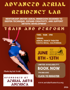 Sponsored by Aerial Arts America, in cooperation with the Ruby Karen Project, this workshop is catered to pre-professional teen and adult aerialists, This 5-Day mentorship-driven aerial immersion session is designed to deepen technique, expand creativity, discovery and support artistic development and enlighten the pathway to a professional career. Participants will apply the strategies into a work-in progress act that will be showcased on the 6th day – Saturday, June 13. This residency will be taughted by local and visitng instructors. Attendance threshold is observed. Deadline for registration is: May 15, 2026.